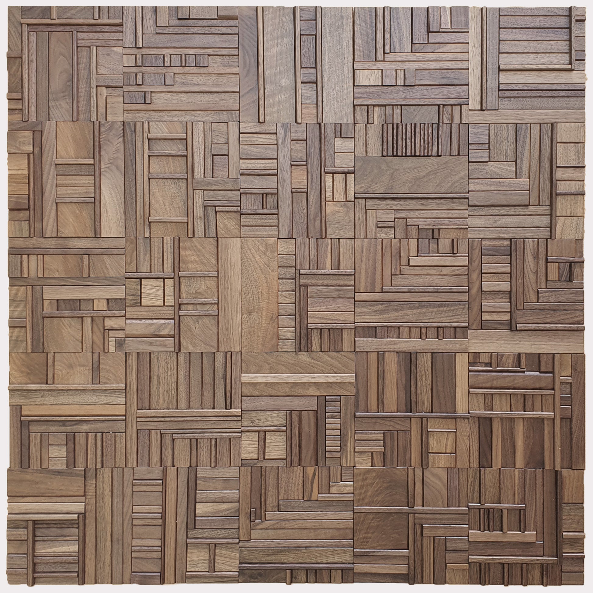 3D mosaic wall tiles, made from solid walnut strips of random widths and thicknesses. Strips are bevelled, sanded and assembled on a 6mm hardwood plywood base. Tiles are finished with high quality, durable hard wax oil, ready to be glued to a wall or any other flat surface.