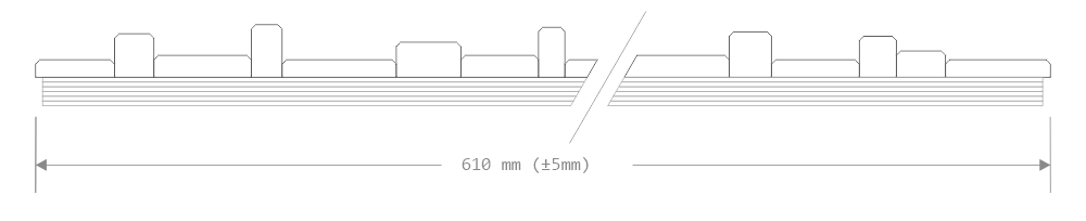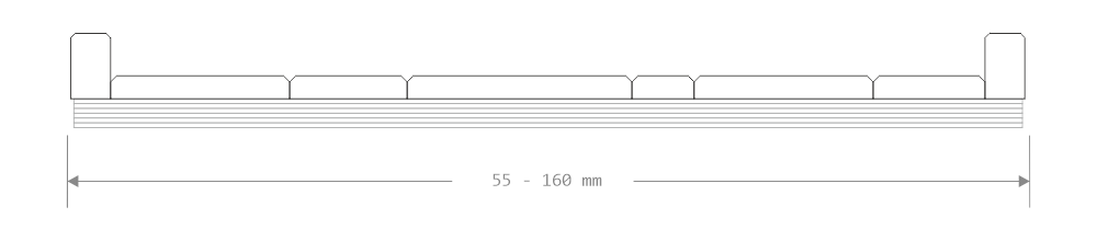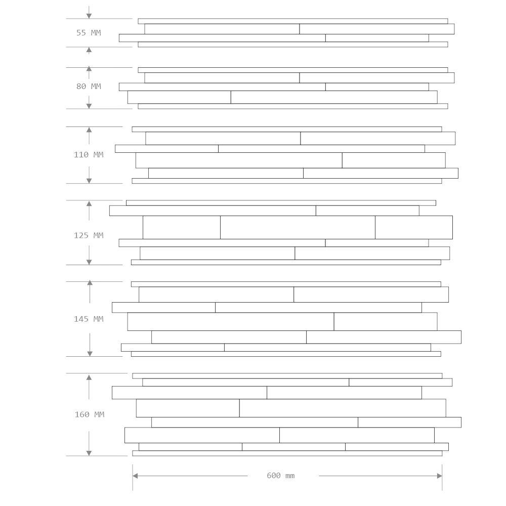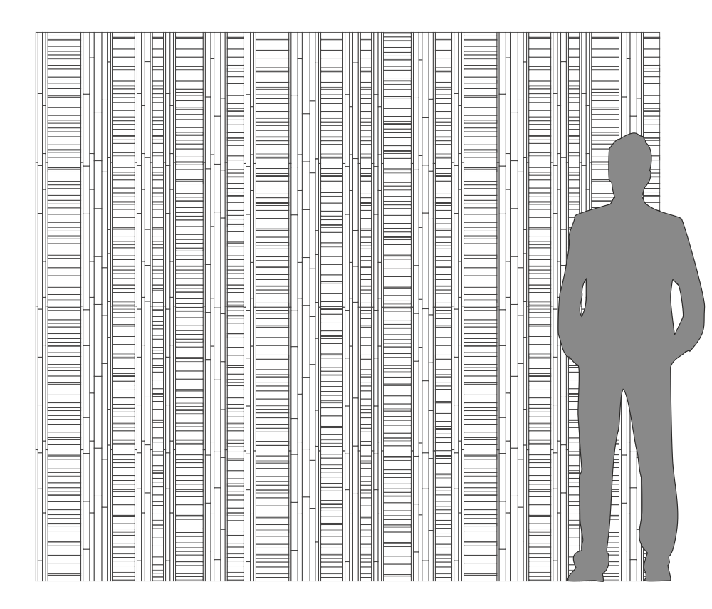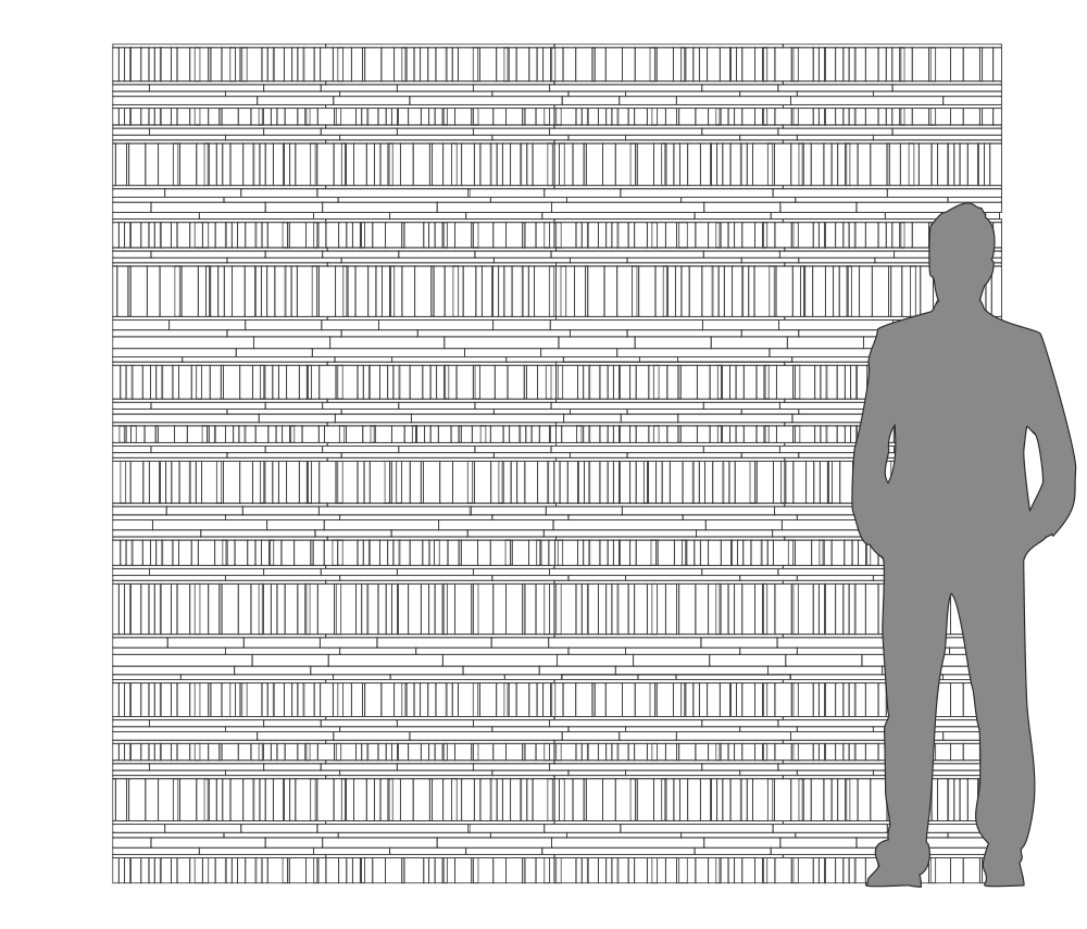 The design is created with two types of tiles: reticular tiles that create the rows with vertical lines, while rows with horizontal lines are made of interlocking tiles. Six row sizes of 50, 75, 100, 125, 150 and 200mm, the length of each tile is 610 mm (±5).